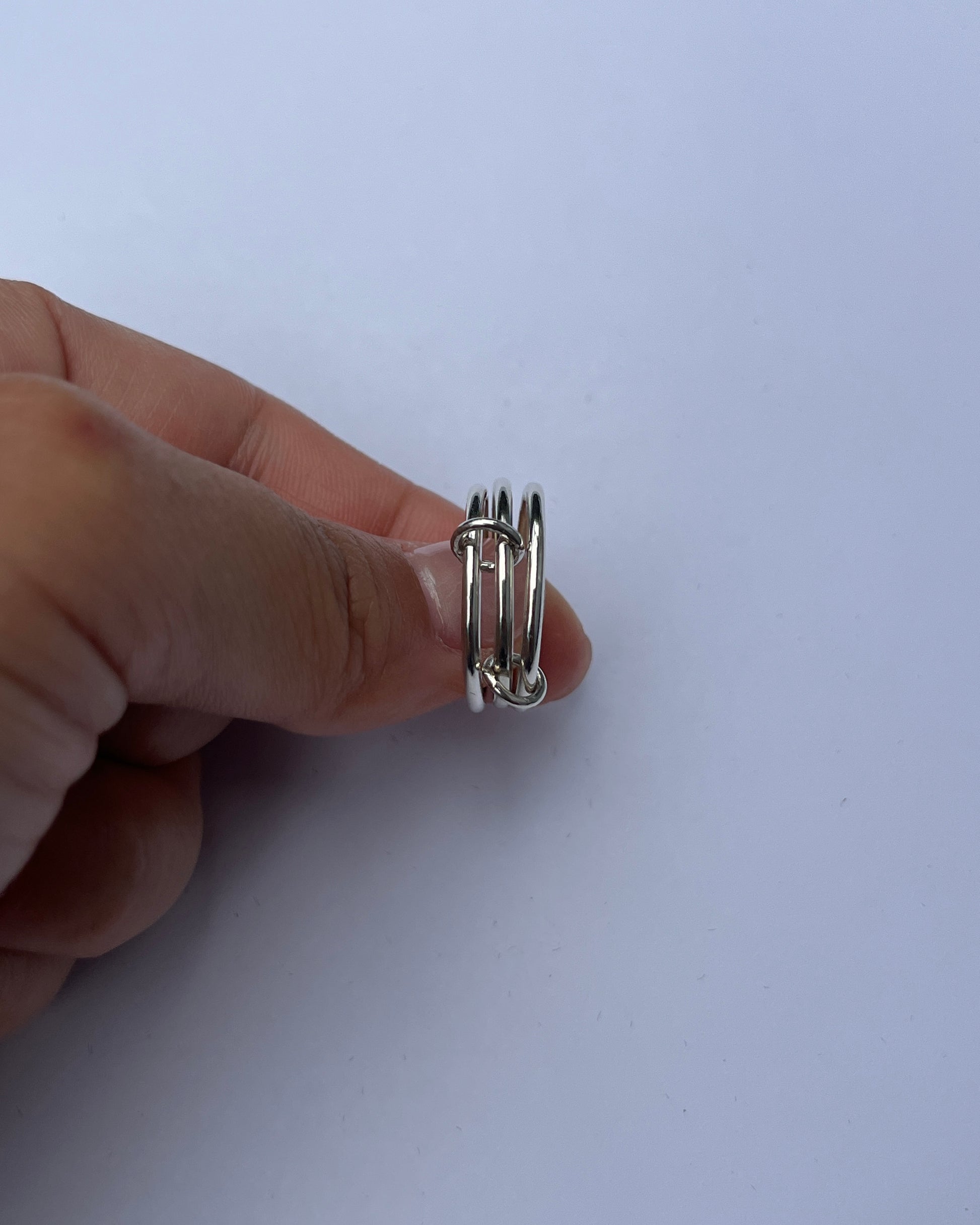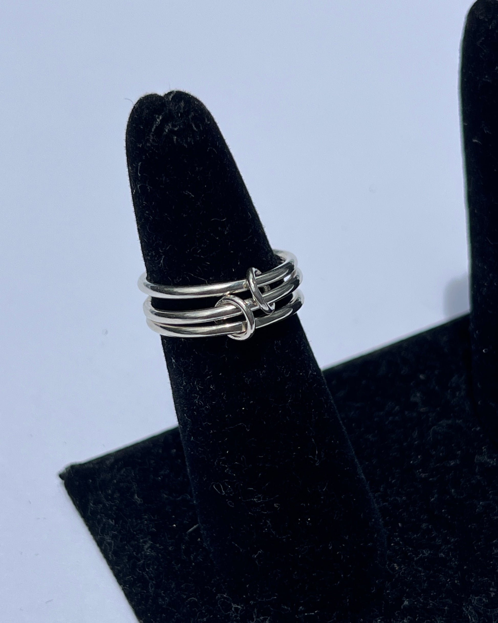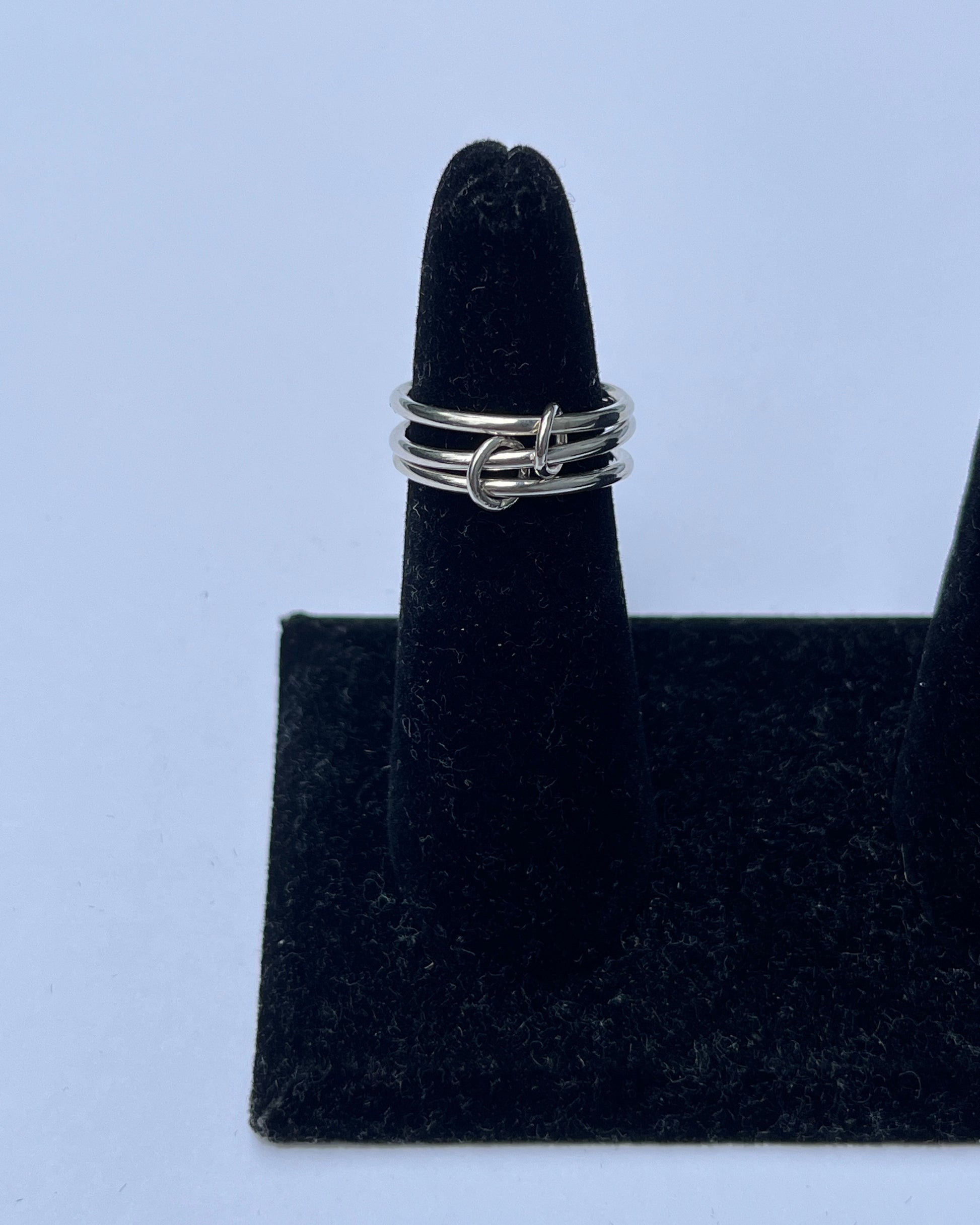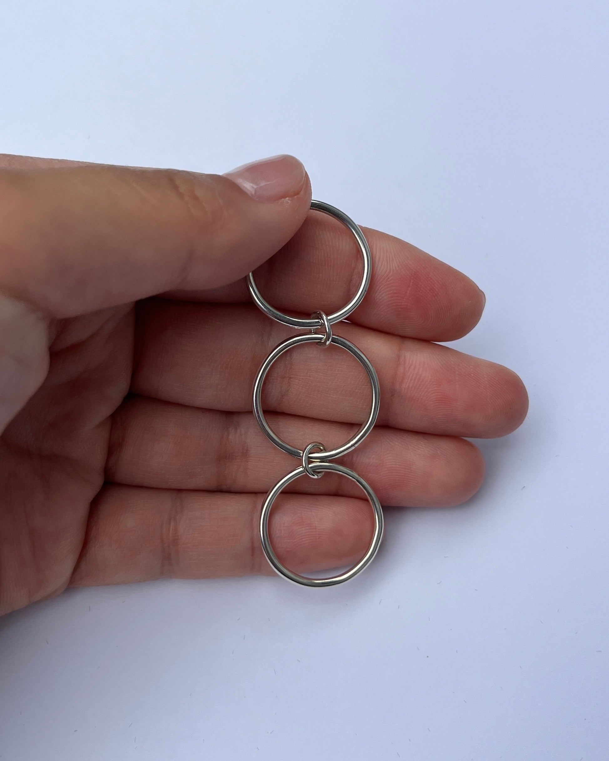 Three stacked rounded bands with two hoop connectors. Handmade from sterling silver.