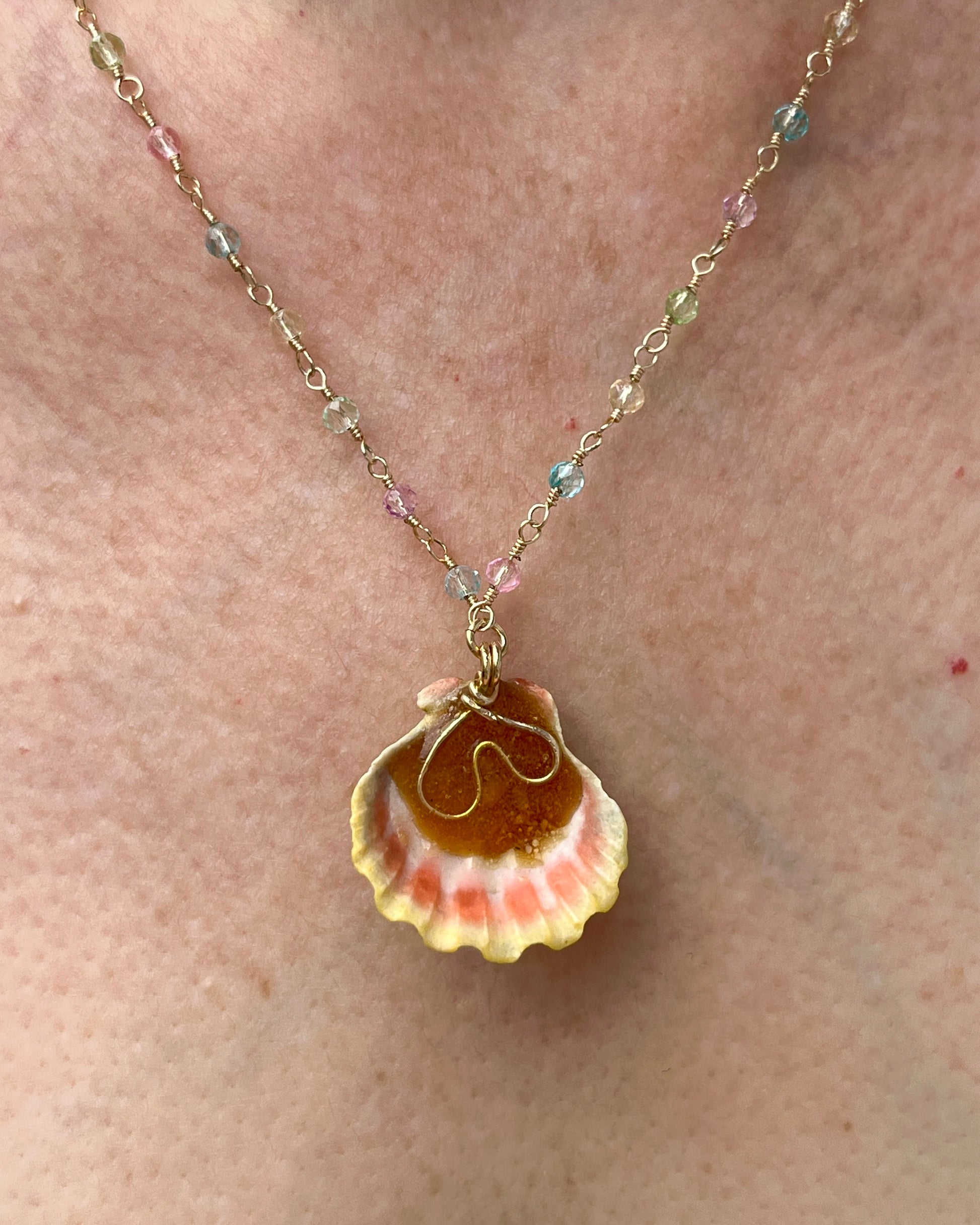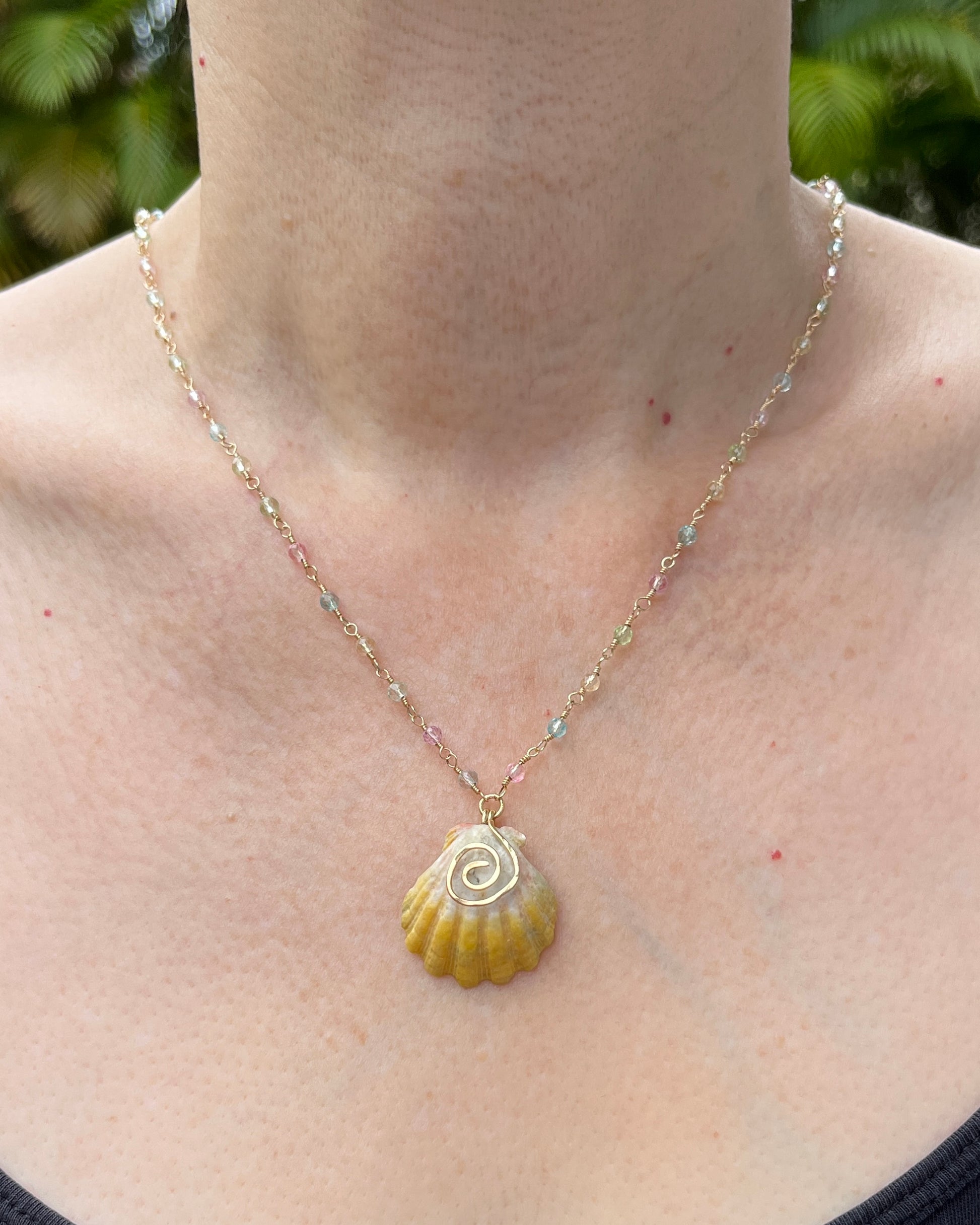 Handmade crystal wire wrapped beaded necklace with sunrise shell pendant and gold filled hammered swirl detailing.