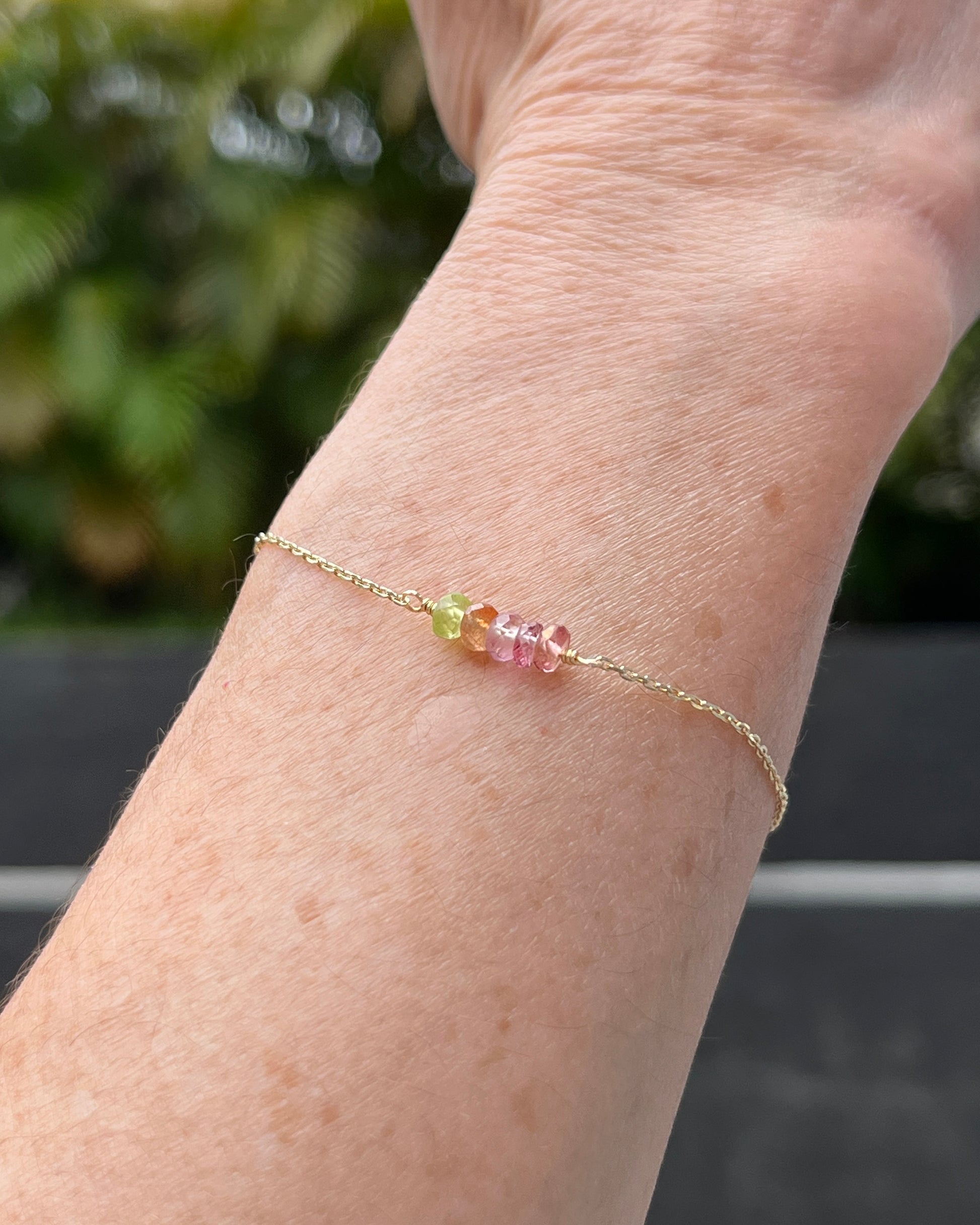 5-stack watermelon tourmaline crystal dainty bracelet. Made from gold vermeil.